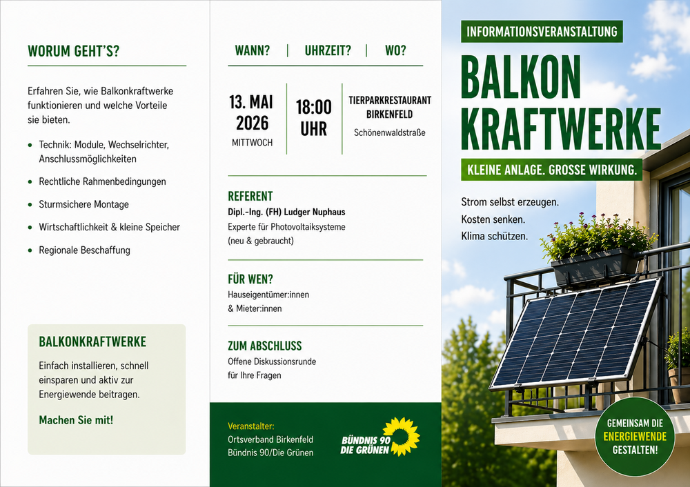 Im Rahmen der Förderung einer nachhaltigen und bürgernahen Energiewende lädt der Ortsverband Birkenfeld von Bündnis 90/Die Grünen, zu einem Fachvortrag über die Implementierung kleiner Photovoltaikanlagen ein. Die Veranstaltung findet am 13. Mai 2026, 18:00 Uhr, in der Tierparkgaststätte Birkenfeld, Schönenwaldstraße statt.
