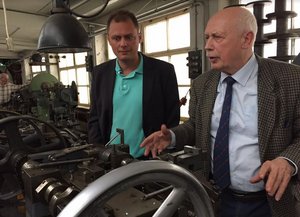 Anschließend ging es zu Fuß in die Wilhelmstraße zu der ehemaligen Schmuckwaren und Uhrenkettenfabrik Jakob Bengel. Herr Braun und Herr Bauer führten die 15-köpfige Gruppe durch die historischen Räumlichkeiten und erklärten sehr anschaulich die Historie, Technik und Verarbeitung des bekannten Obersteiner Art déco Schmucks. Landtagsabgeordneter Daniel Köbler zeigte sich beeindruckt von der Obersteiner Industriegeschichte und versprach sich für den Erhalt und die Förderung dieses bedeutenden Industriedenkmals einzusetzen.