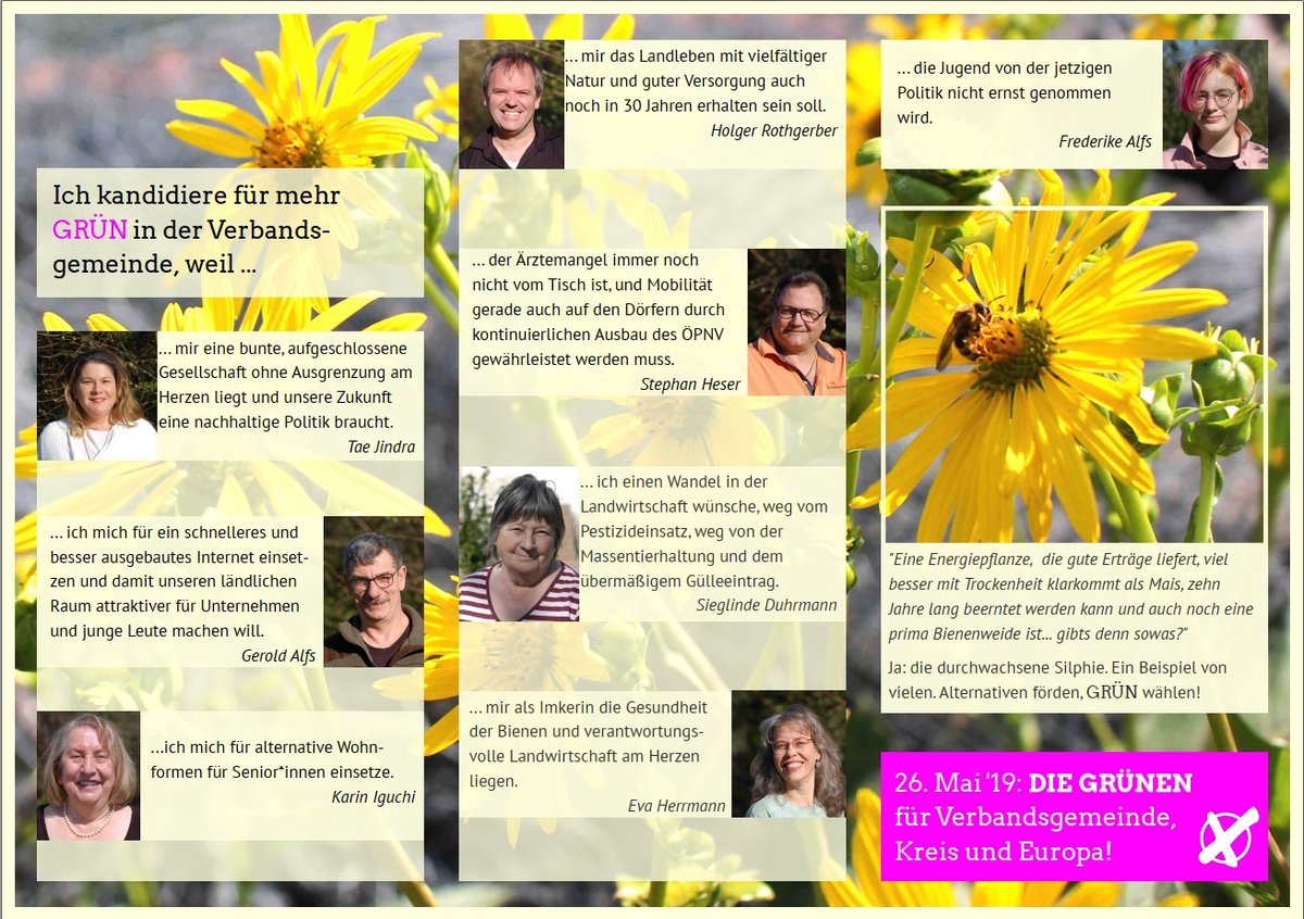 Ganz nach dem Motto “Wir brauchen Dich! Global denken, lokal aktiv werden.” will sich das Team für eine umwelt- und klimafreundliche, soziale, gleichberechtigte und transparente Verbandsgemeinde stark machen.